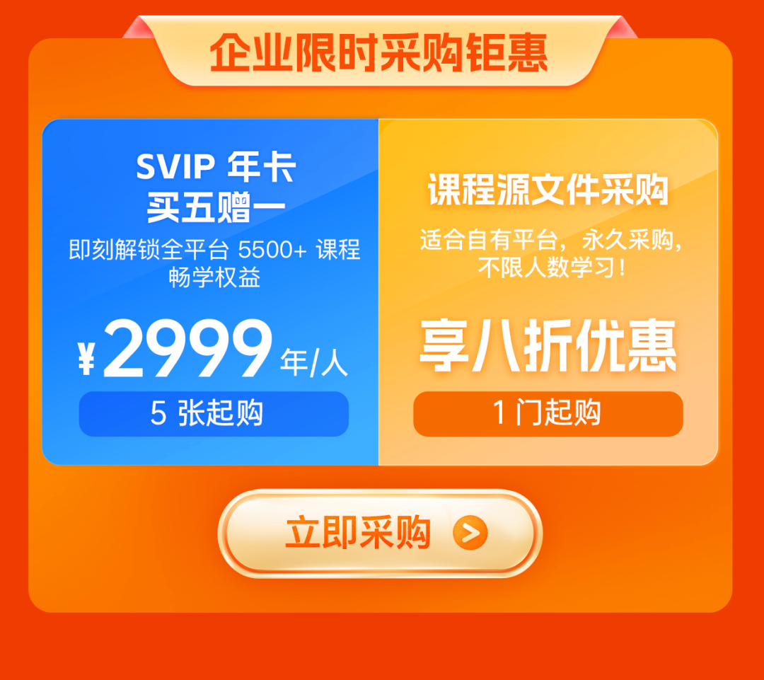 在线课程采购优惠:SVIP 年卡买五赠一,在线课程源文件采购享八折优惠。