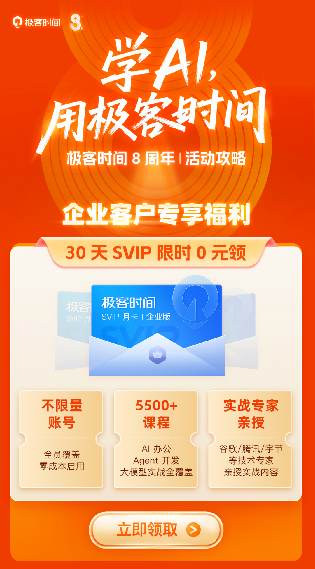 目前,极客时间企业版平台已积累 5500+ 门在线课程,覆盖 AI 从认知到实战全阶段,聚焦企业真实业务场景。值此极客时间 8 周年庆之际,特推出 SVIP 月卡免费领和线上课程采购优惠等专项活动: